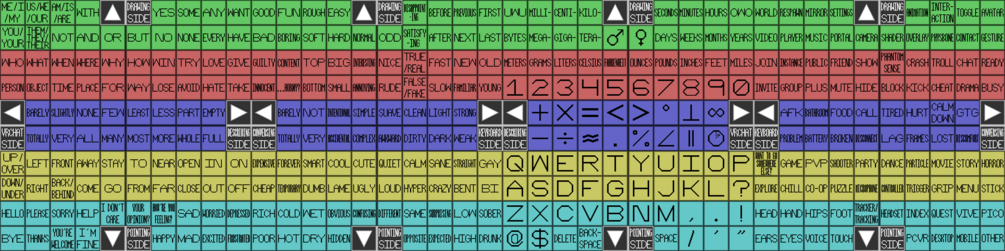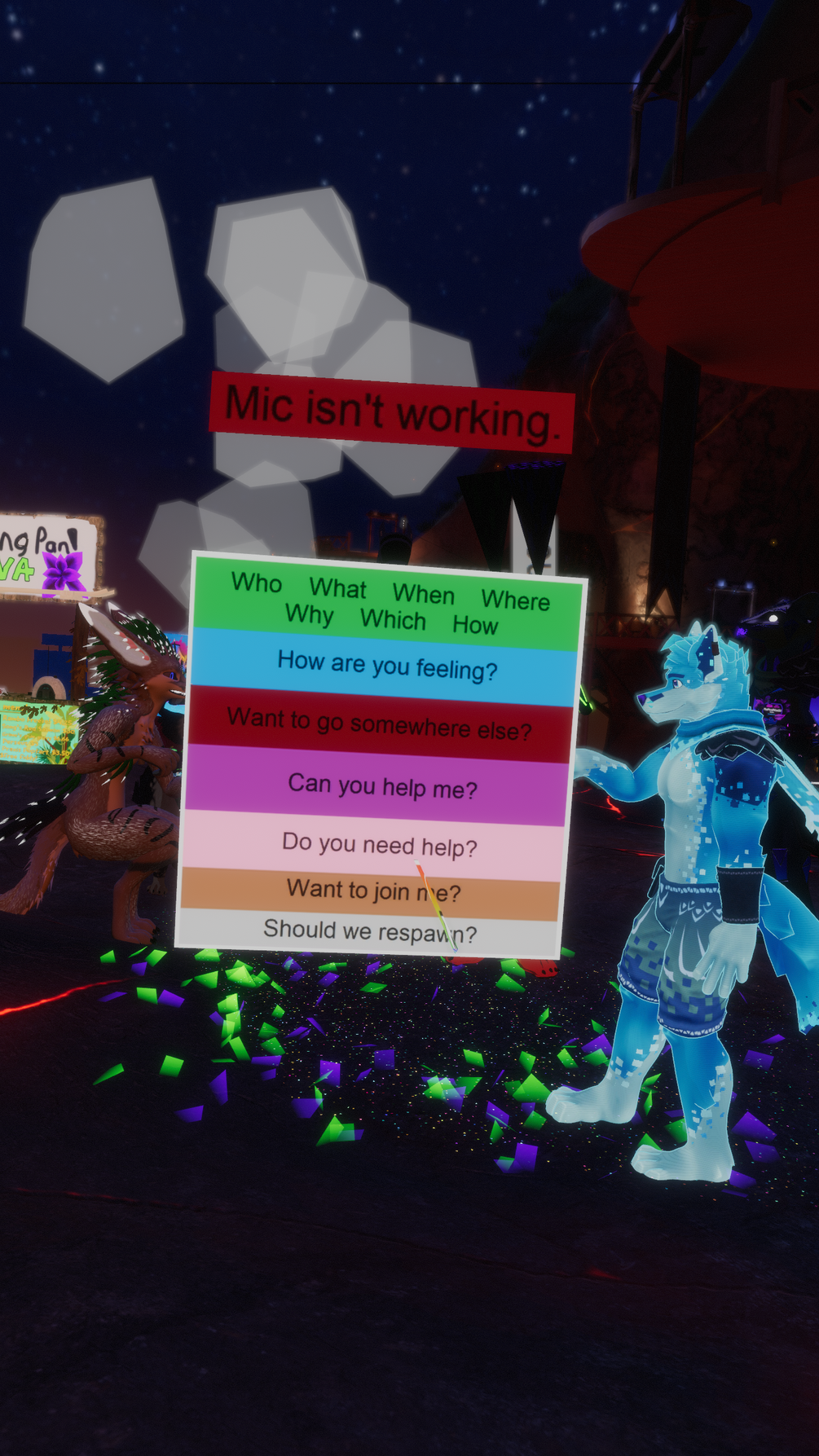 The improved Mute Cube! This one features 368 buttons featuring different words or phrases (92 each on four sides)! These buttons can either be pressed with your avatar's fingers, or with the pointer that floats in front of the Mute Cube in order to pop up that word and speak it aloud. And this time, you don't actually have to touch the pointer to the cube to trigger a button; all you do is click the trigger while holding the pointer, which poses the Physbone and presses whatever button the pointer is looking at!